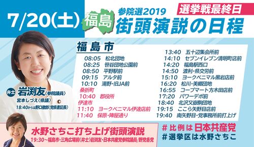 参院選は残すところ、いよいよラスト1日になりました。ラストデーの20日(土)、福島市内を運行します。 選挙戦は比例も選挙区も大激戦です。みなさんの1票1票が政治を動かします!ぜひまわりの方にも「比例は共産党」「選挙に行こう」と声を広げてくださ…