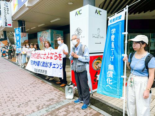ゲストスピーチする県市民連合の伊藤氏=9/12、福島市 福島県革新懇は、自民党総裁選告示日にあわせて12日、「自民党政治さよなら」街宣を福島市内で行いました。 県革新懇の藤倉英一事務室長の進行で、ふくしま県市民連合の伊藤宏之氏がゲストスピーチ。参…