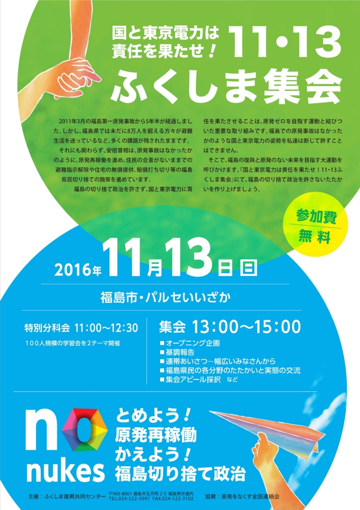 11月13日(日)は、ふくしま復興共同センターが主催して「国と東電は責任を果たせ!11.13ふくしま集会」が福島市パルセいいざかで開催されます。