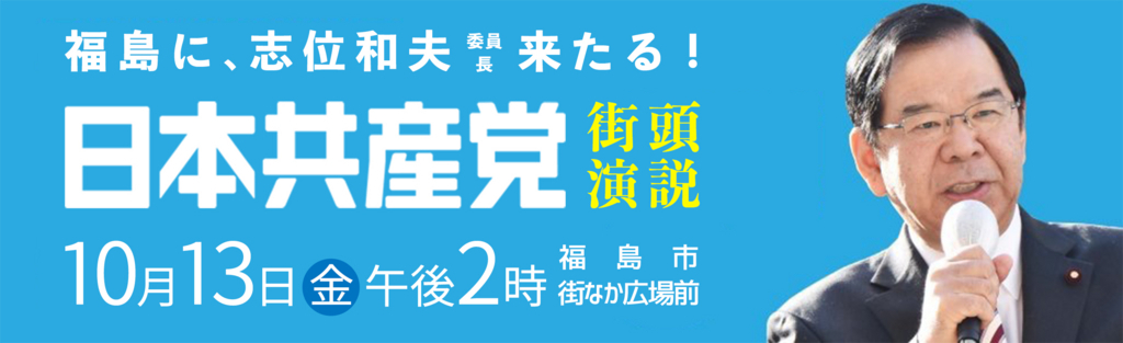 10月13日は、福島市に志位和夫委員長が福島市に入り、街なか広場前から今の政治局面と選挙の争点を訴えます。