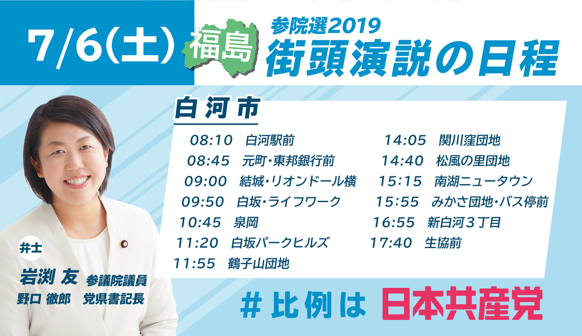 2019-07-05 参院選3日目の街頭演説日程 【参院選3日目】福島県の日本共産党の選挙カーは白河市を走ります!🚐岩渕友参院議員も応援にかけつけます!街頭演説場所にぜひお集まりください!! #比例は日本共産党 #くらしに希望を