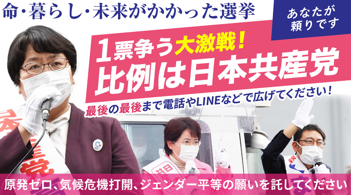 比例も選挙区も1票争う大激戦です。原発再稼働やコロナ禍で病床削減進める自公政治か、原発ゼロで気候危機打開に本気で取り組み、いのち守る政権交代か、1票1票が勝敗を分けます。どうか日本共産党へお力をお貸しください!
