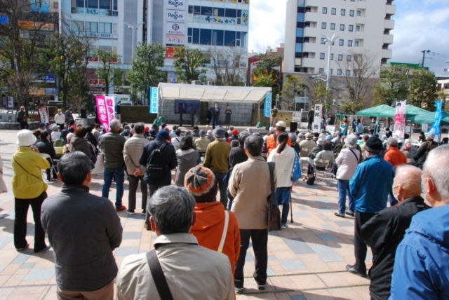 笠井亮衆院議員を弁士に3月27日、JR郡山駅前広場で日本共産党の街頭演説会が開かれ、「福島の心」を国会に届けるいわぶち友参院議員・比例候補をふたたび国会へ、比例5議席を必ずとの訴えに約400人の聴衆が拍手でこたえました。オンラインで全県に配信され、1300人以上が視聴。会場周辺では民青同盟のみなさんが約60人の若者と対話しました。