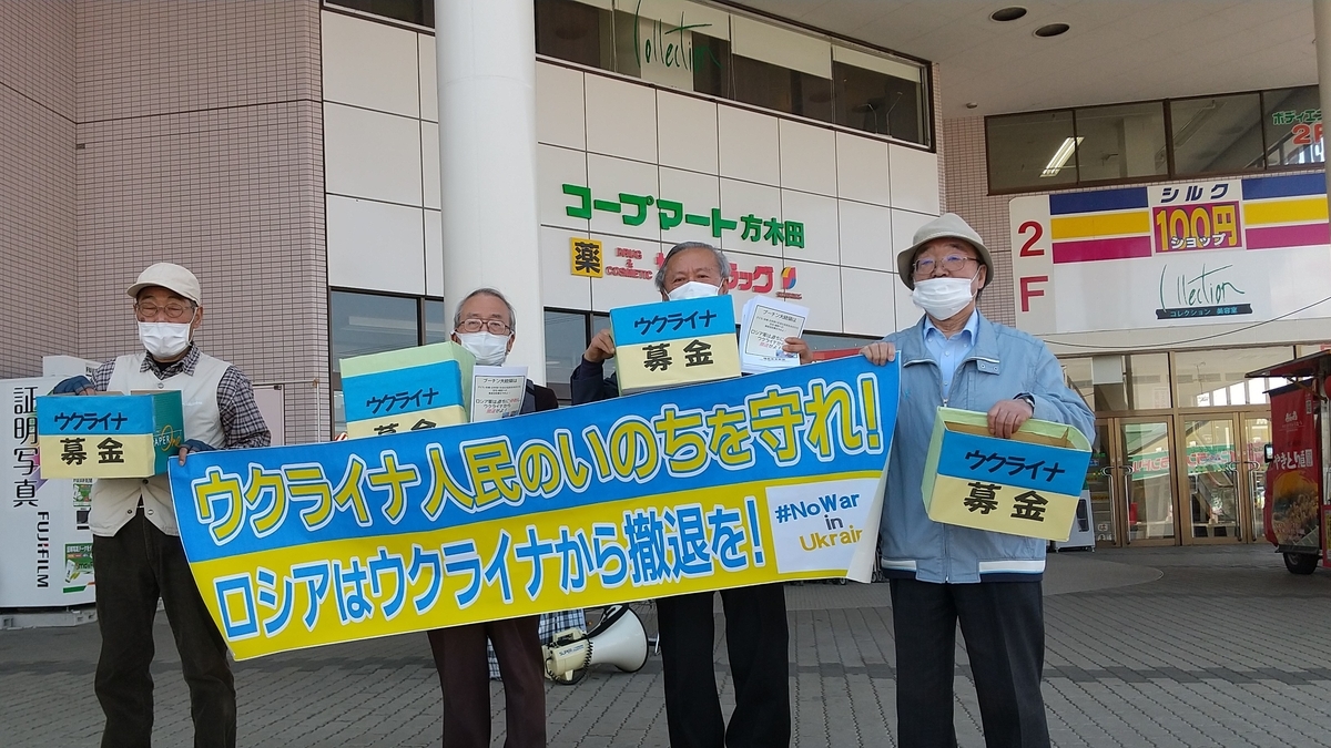 また9日には、「ロシアはウクライナから撤退を!」の横幕を掲げ、コープふくしま方木田店(福島市内)前でチラシを配りながらウクライナ支援募金に取り組み1万8438円の募金が寄せられました。