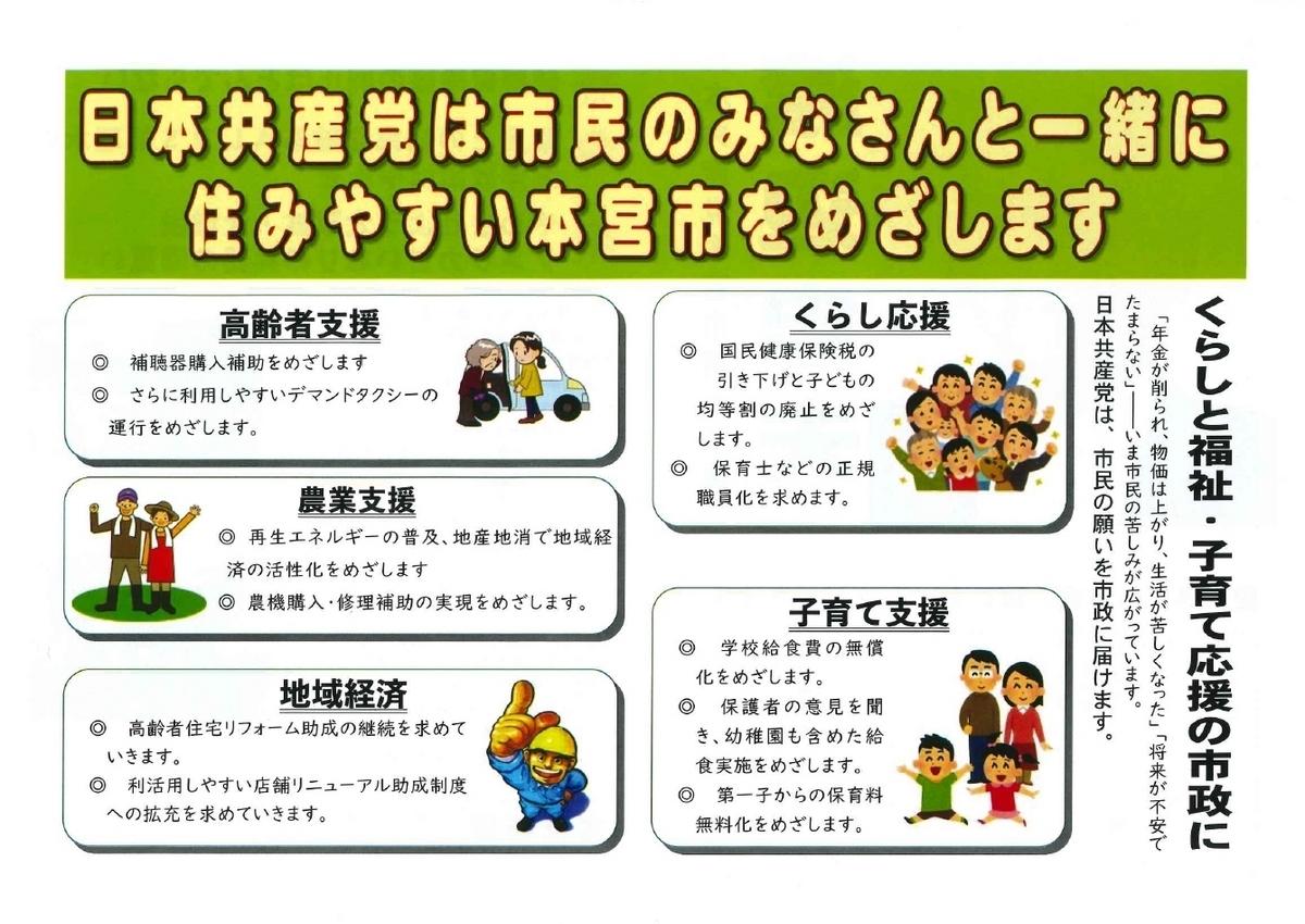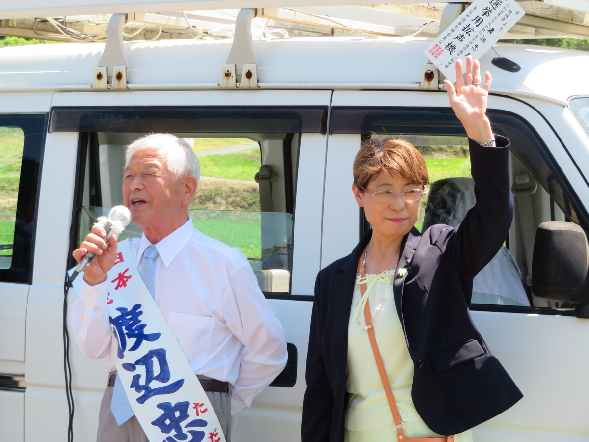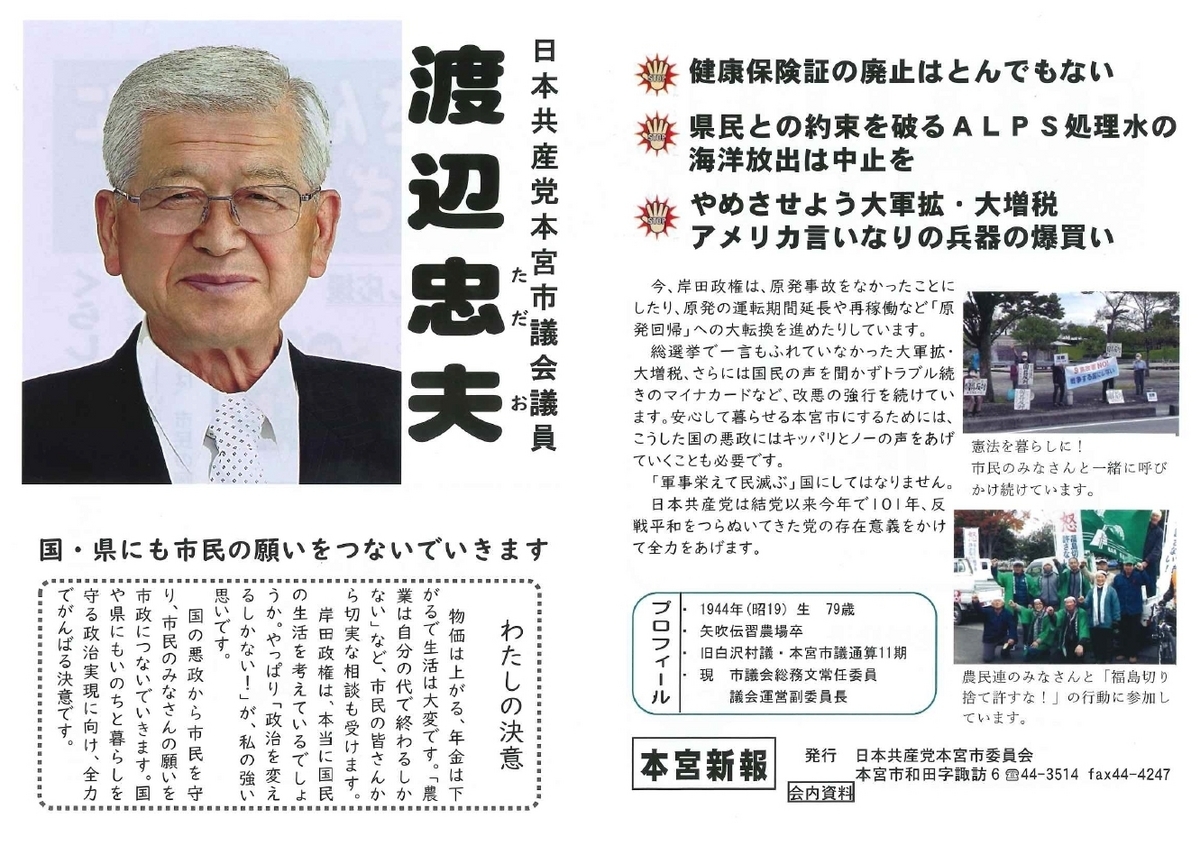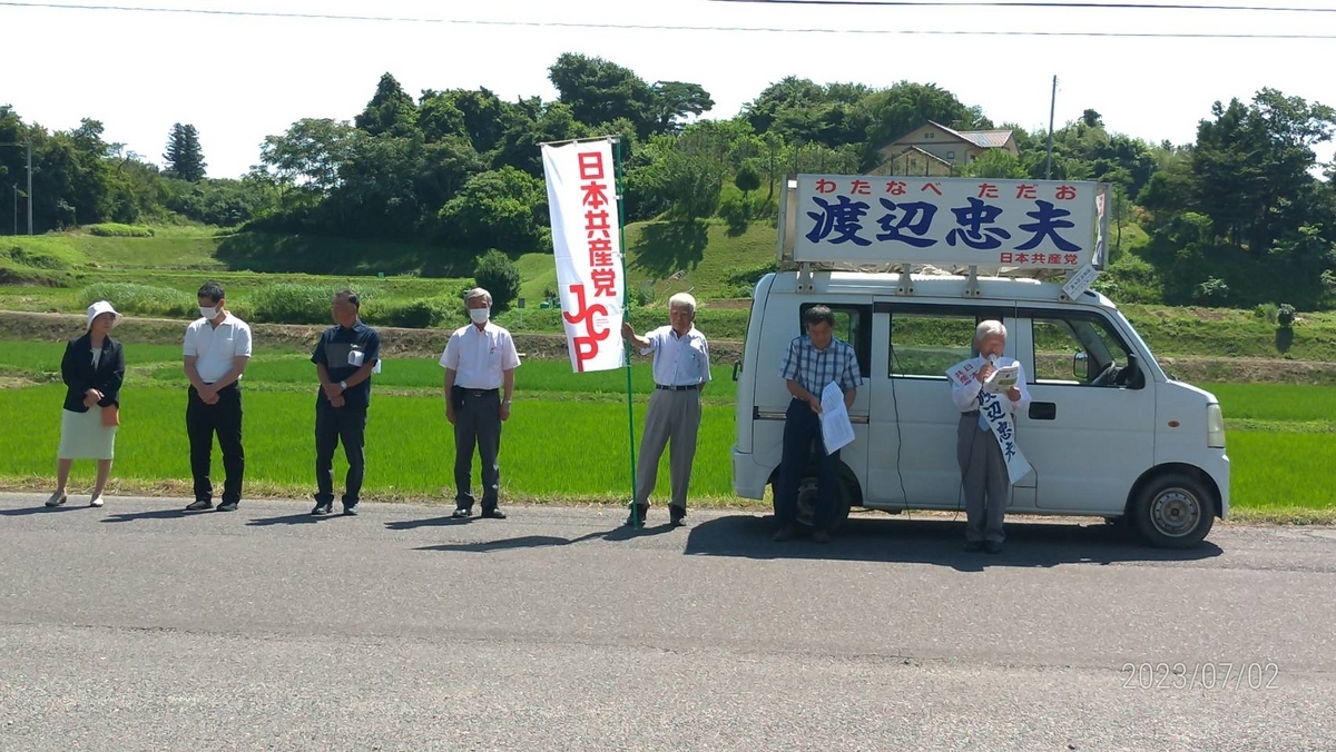 2023-07-02 7月2日告示、9投票!本宮市議選へご支援を! お知らせ ニュース 選挙関連 本宮市議選(定数20、立候補23)が2日に告示され、日本共産党は、渡辺忠夫氏(79・現)が立候補しました。 渡辺候補は、2日の第一声で、国保税の引き下げと子供均等割廃止、学校給食費の無料化などを訴えました。 日本共産党議席を守るために、大きなご支援をお願いします。 第一声で訴える渡辺忠夫候補。2日午後はいわぶち友参院議員と訴えました 神山悦子県議とともに訴える渡辺候補 渡辺忠夫の政策チラシをごらんください。
