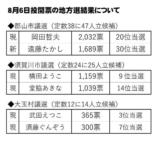 8月6日投開票で行われた郡山市、須賀川市、大玉村議員選挙で日本共産党にお力添えいただいたすべてのみなさんに心より敬意を表します。