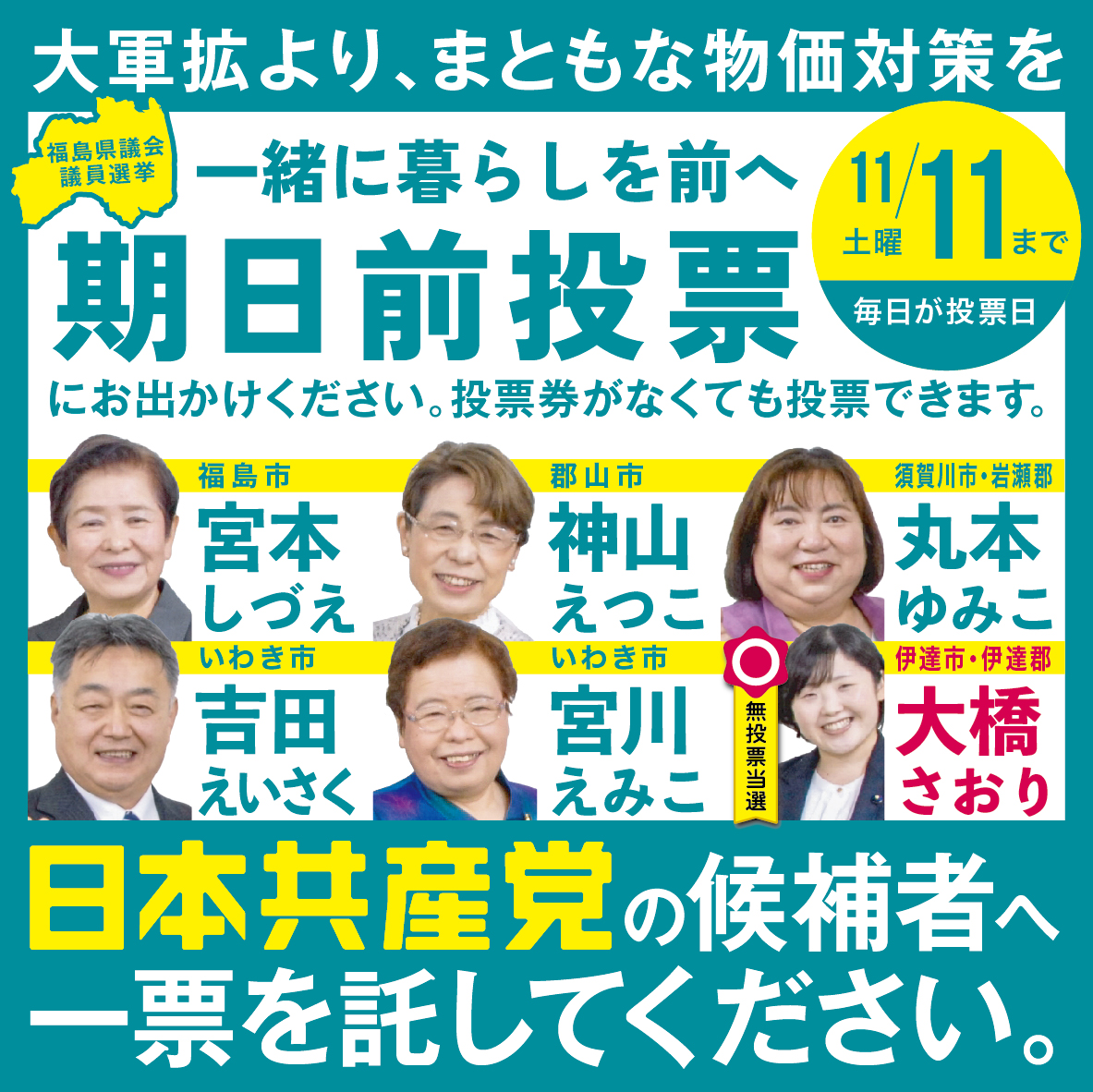 2023-11-04 福島県議選 4日、小池晃来たる! 福島県議選は3日目となり、4日は小池あきら書記局長が県内の各所で訴えています。暮らし守る党5議席確保、6議席躍進へ!動画も配信していきます。 期日前投票は、毎日できます。ぜひこのバナーをスマホなどに保存いただいてお出かけください♪ 日本共産党を伸ばして暮らし応援の福島県政へ!日本共産党の候補を広げてください。