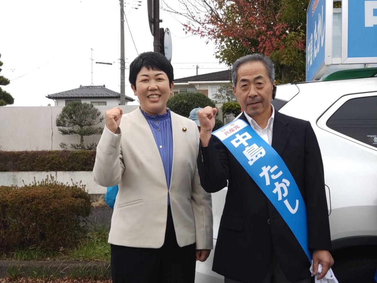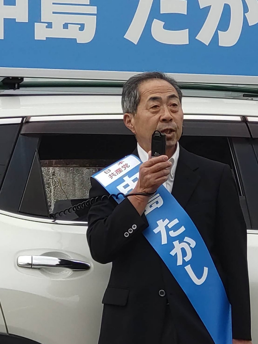 2023-11-07 12日投票!相馬市議選は中島たかし候補必勝を!2人はみ出し少数激戦! 【相馬市議選・11月12日投票】 相馬市議選は5日に告示され、日本共産党は中島たかし候補(新)を擁立し、当選へ全力をあげています。定数18に現職17人、新人2人の19人が立候補、少数激戦です。 ◆中島たかし(なかじま・孝) (プロフィール) 1956年生まれ、自営業。相馬高校、早稲田大卒。「生業を返せ、地域を返せ!」福島原発訴訟原告団長として賠償を勝ち取る。今回、相馬市議選に初挑戦。 全県から相馬市のお知り合いへ中島候補の支持を広げてください。 第一声をあげる中島たかし候補 いわぶち友参院議員も相馬市議選・中島たかし候補の第一声で訴えました 中島候補の政策チラシをご覧ください。