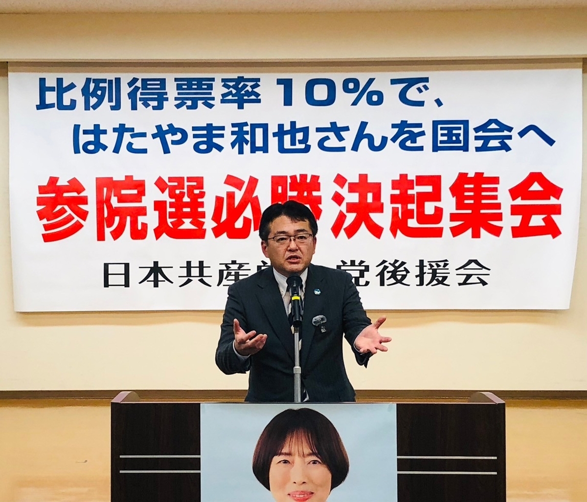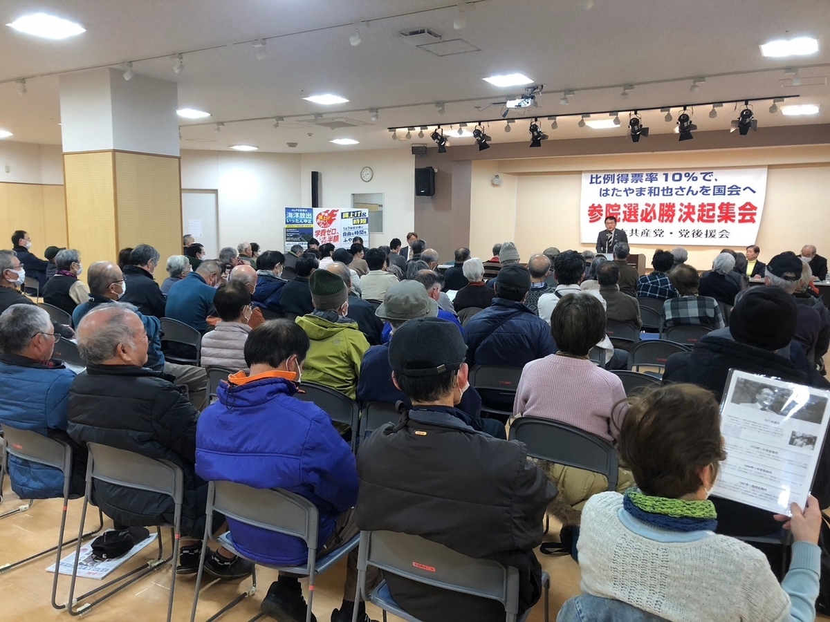 日本共産党県委員会と福島相馬地区委員会は共催で8日、はたやま和也参院比例候補を迎えた参院選勝利とそこに向けた自力をつけるための決起集会を福島市内で開催しました。100人を超える参加者で会場はいっぱいとなりました。