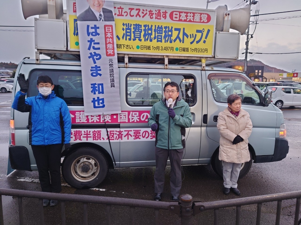 参院比例候補の発表以後、初めて福島県入りしたはたやま候補は、宮城県石巻市出身で両親が食堂を営んでいた生い立ちから格差や消費税の矛盾などを感じて成長してきたこと、宮城教育大学在学中に戦前から戦争に反対していた党があったことに衝撃を受けて入党したことなどを交えて自己紹介。東日本大震災復興特別委員も務めていた衆院議員時代に、原発事故被害の調査や災害調査で福島県に入ったことにも触れながら、「衆院で少数与党となった国会で、今度は参院選でも自公を少数にするため比例の5人全員を当選させていただいて、私も国会に送り出してほしい」と訴えました。